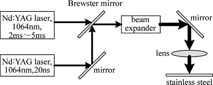 復合激光脈沖打孔實驗裝置如圖 1所示。兩束激光波長均為1064nm,毫秒激光脈寬2ms~5ms可調,頻率為30Hz,單脈沖能量為2J~5J,聚焦光斑為300μm,納秒激光脈寬為20ns,頻率為10kHz,單脈沖能量為1.5mJ,聚焦光斑為100μm。兩束激光通過布儒斯特片非相干合束,經過擴束準直,聚焦于厚度為5mm的SUS 304不銹鋼表面。