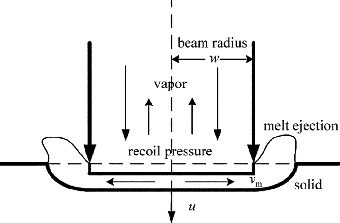 在以蒸發反沖壓強使液體濺射為主的排出機制下,材料通過蒸發形式損失的質量可被忽略,則打孔速率u可被表示為: